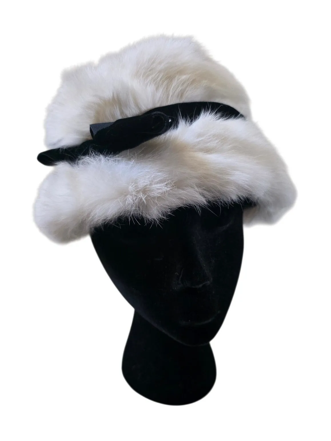 This Vintage Brentshire White Rabbit Fur Hat Bucket is a luxurious accessory perfect for a party in the 1950s. Made in the United States, this original piece exudes an Art Deco look with its black ribbon detail. The size XS makes it a unique and stylish choice for women who appreciate vintage fashion. The white rabbit fur adds a touch of elegance, making this hat a standout piece in any wardrobe.