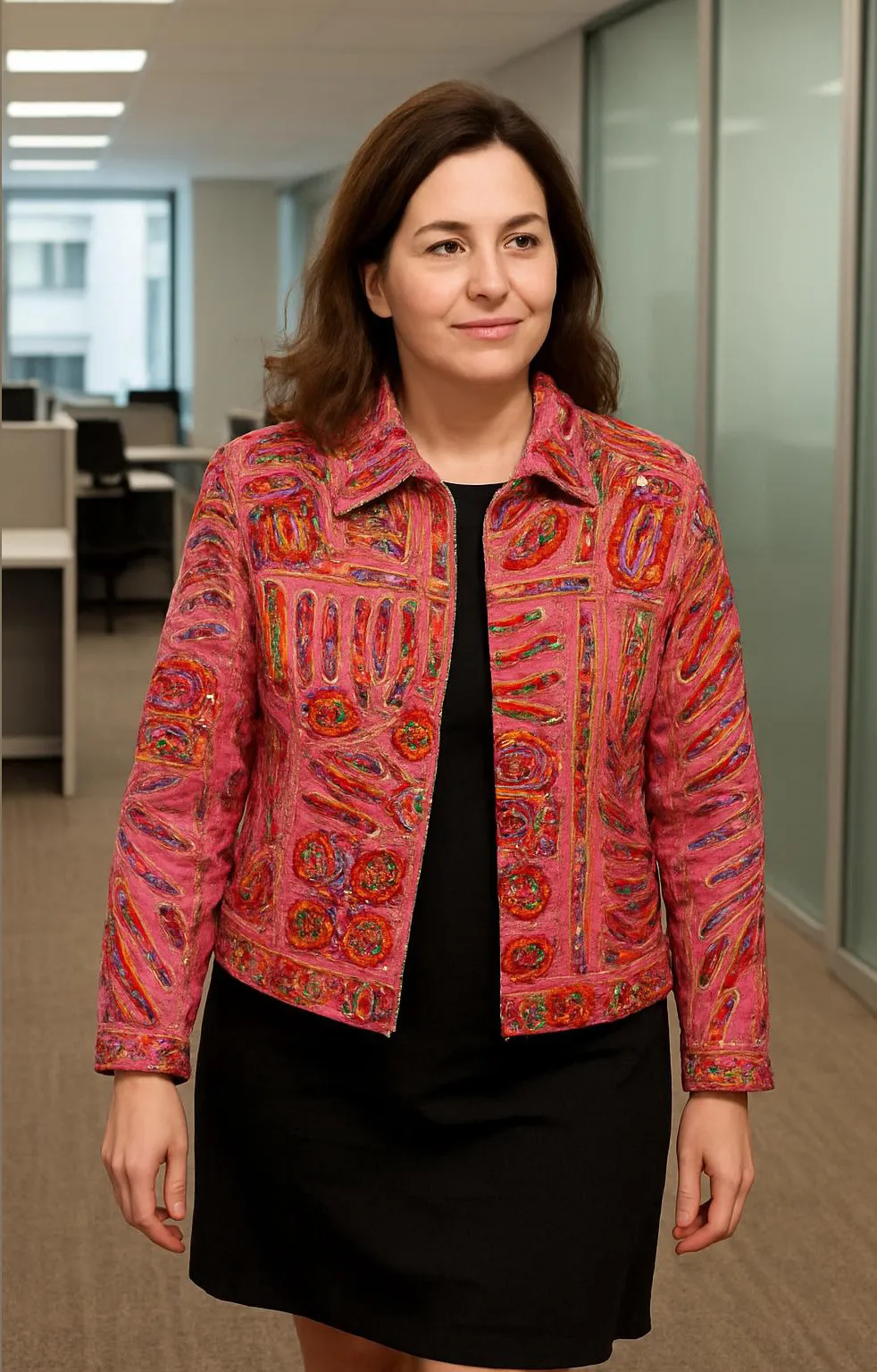 Vibrant and stylish women's jacket featuring a unique multicolor design. Perfect for adding a pop of color to any outfit. Fully lined Matching patchwork style buttons Approximate measurements Keywords: seamstress, calico, designer, fun, artsy, wearable art, zig zag, rick rac, rainbow, barbiecore, gold, pink, purple, red, yellow, turquoise, silk, dress jacket, Inventory LW4.5.25.4 - I use recycled packaging or packaging than can be recycled if possible. Stock photo is AI generated and might be slightly different than actual item. Please see all images and description. Questions welcome