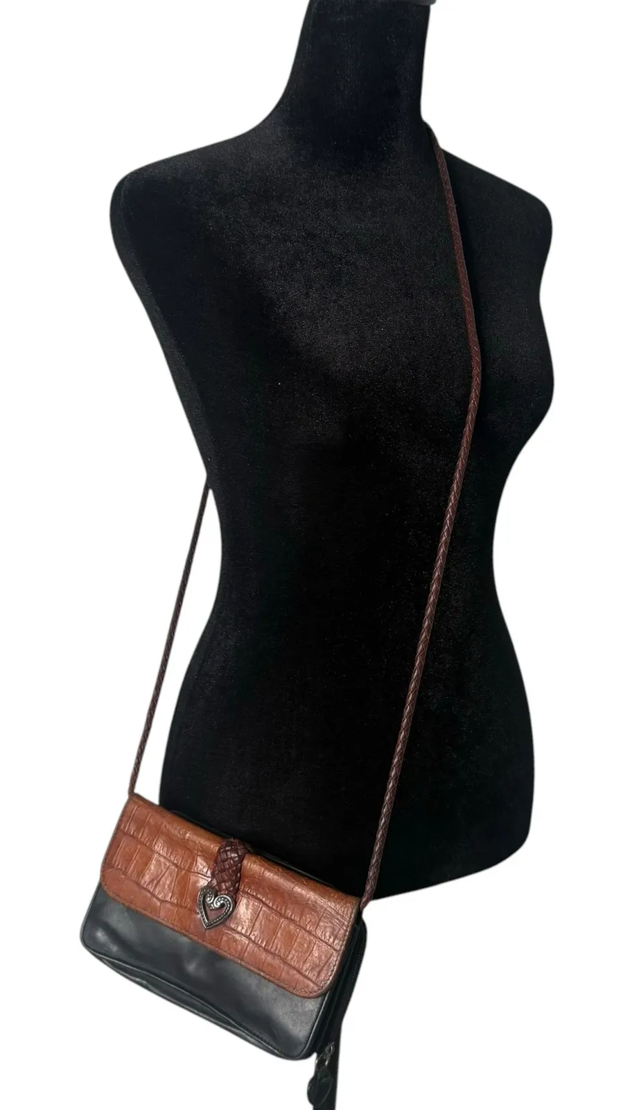Vintage Brighton Crossbody Bag Organizer Leather Heart Accent Brown Black Braided Woven Strap Has... Show more