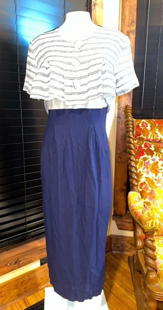 This elegant blue midi dress features a sleek pencil silhouette, perfect for a professional setting. Its form-fitting design and classic length offer a sophisticated look, making it ideal for work or cocktail occasions. Crafted with a focus on style and comfort, this dress is a versatile addition to any wardrobe. Note that as a vintage dress, it may have some small flaws due to age. Material: 64% acetate 36% rayon Measurements: Waist: 16 inches Hips: 21 inches Hem: 20 inches Length: 51 inches #Vintage #MidiDress #PencilDress
