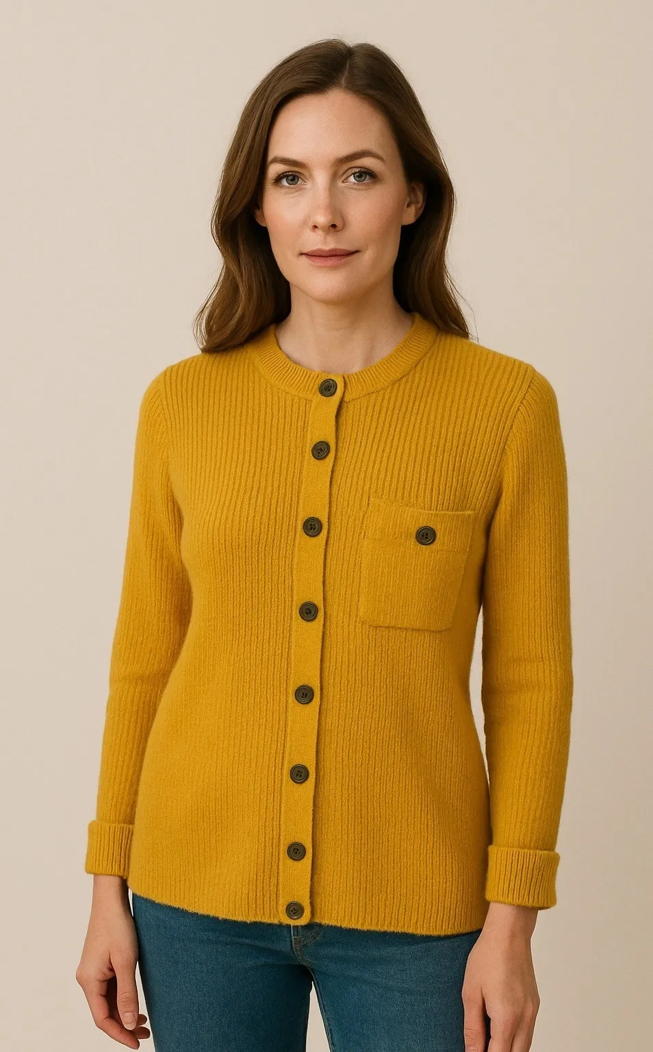 The Broadway Cardigan Sweater Womens Medium/Large - no size tag, based on measurements below Marigold Yellow Cashmere Wool Blend Wood Buttons Breast Pocket Vintage Approximate Measurements Laying Flat Across: Chest: 19 inches Length: 28 inches Sleeve: 24 inches Good preowned condition - no rips, stains, or tears. Seller Notes: -Same/Next Day Shipping -Smoke Free & Pet Friendly Home
