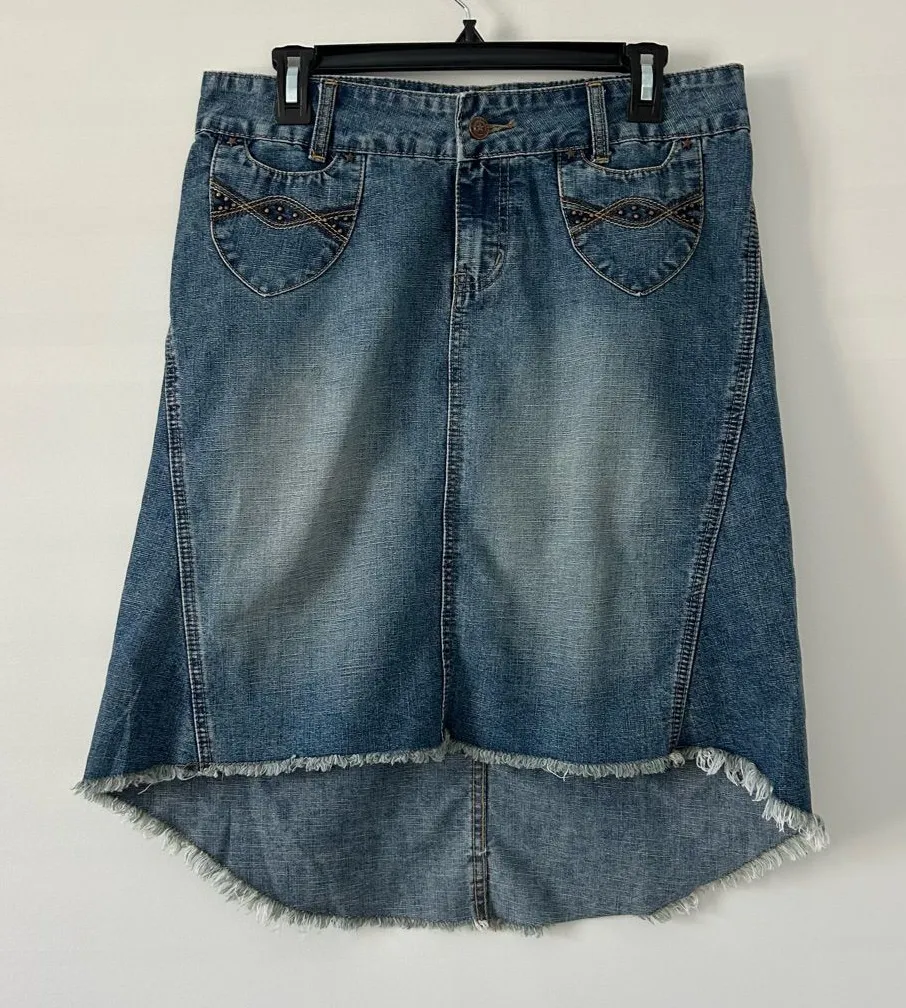 Vintage Bubblegum Y2K Frayed Hem Denim Jean Skirt Size 7/8 Medium Fabric Cotton Color Blue with acid wash details Button zip fly U shaped front pockets with rivet design Frayed hem Hi low Above the knee length No holes or stains Excellent used condition 0115