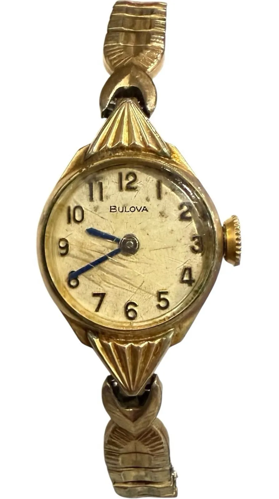 Elegant vintage Bulova women's wristwatch with 10K rolled gold plate bezel and stainless steel back. Features a cream dial with raised numeral markers, blued hands, and ornate lugs. Paired with a gold-tone expansion band. Mid-century style, collectible and timeless. Condition: • Crystal has scratches and wear • Case and band show patina from age • Watch is untested, sold as-is Back Markings: Bulova N5 (1975), 10K R.G.P. bezel, stainless steel back, serial R957999 Era: 1970s (confirmed by case code N5 = 1975)