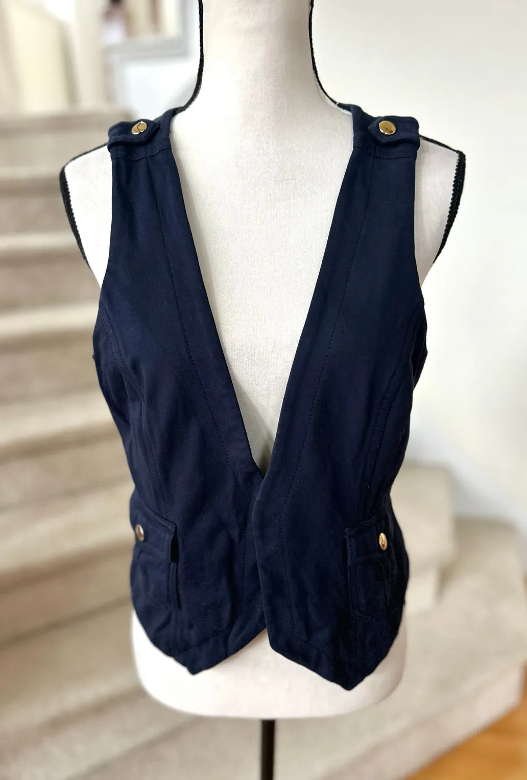Very good condition, minor fabric wear. Dark navy, latch front closure. Adjustable back band. Epaule... Show more