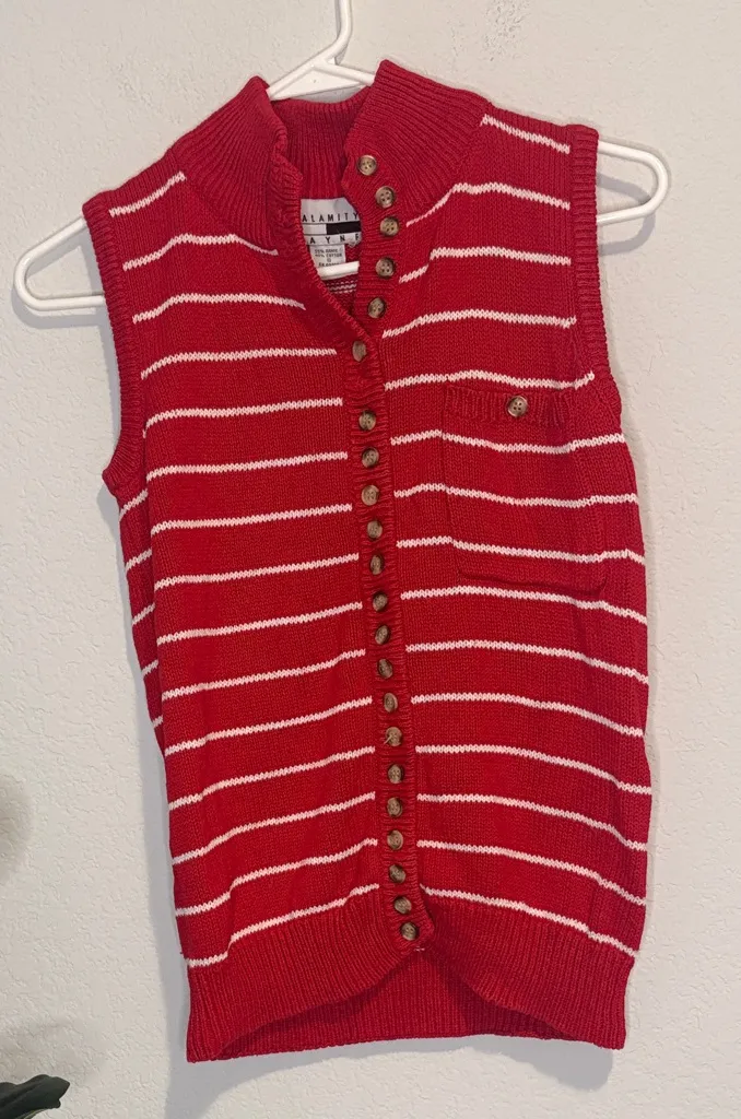 Vintage Calamity Jayne Red and white striped Small knit Sweater Vest. Full Button up with tortoise shell buttons. Pocket on chest. High neck line. Cotton blend. So classy! Chest 16 inches across length 22 inches