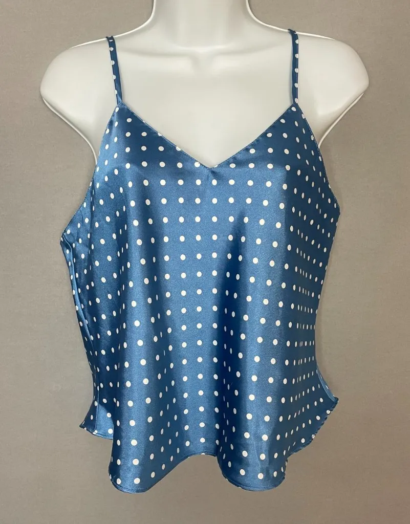 Vintage Katherine Bishop blue polka dot satin camisole tank top with spaghetti straps. Cute for sleep or day wear. Made in Hong Kong. Condition: Gently preloved vintage with small snag and faint spot on front. Size: Medium. See approximate measurements for best fit. Pit to pit: 17.5" Length: 20" Cleaned and from a smoke-free home. Fast shipper!