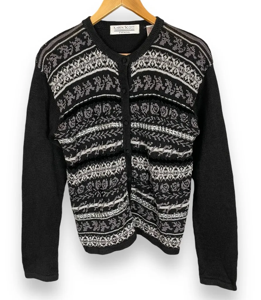 Vintage Karen Scott black and metallic knit cardigan sweater with embroidery details and woven knot buttons. Condition: Preloved vintage with snags, lines, and buttonholes that are tight when buttoning up. Size: Medium. See approximate measurements for best fit. Pit to pit: 18” Length: 21.5” Cleaned and from a smoke-free home. Fast shipper!