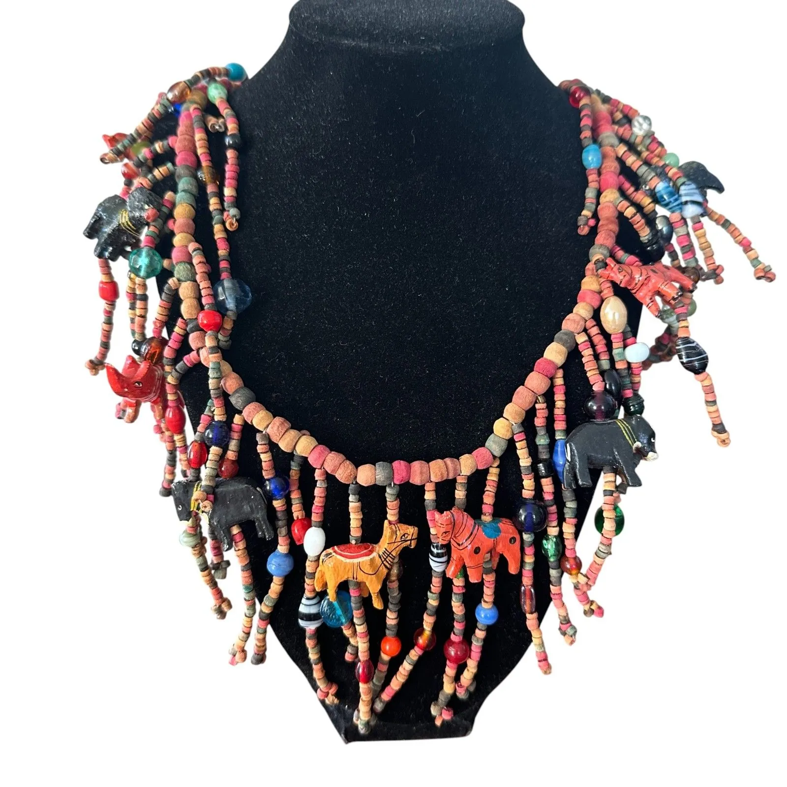 Vintage Carved Animal Wood Bead Folk Art Fringe Necklace Statement Bohemian - $55 - From Morningside