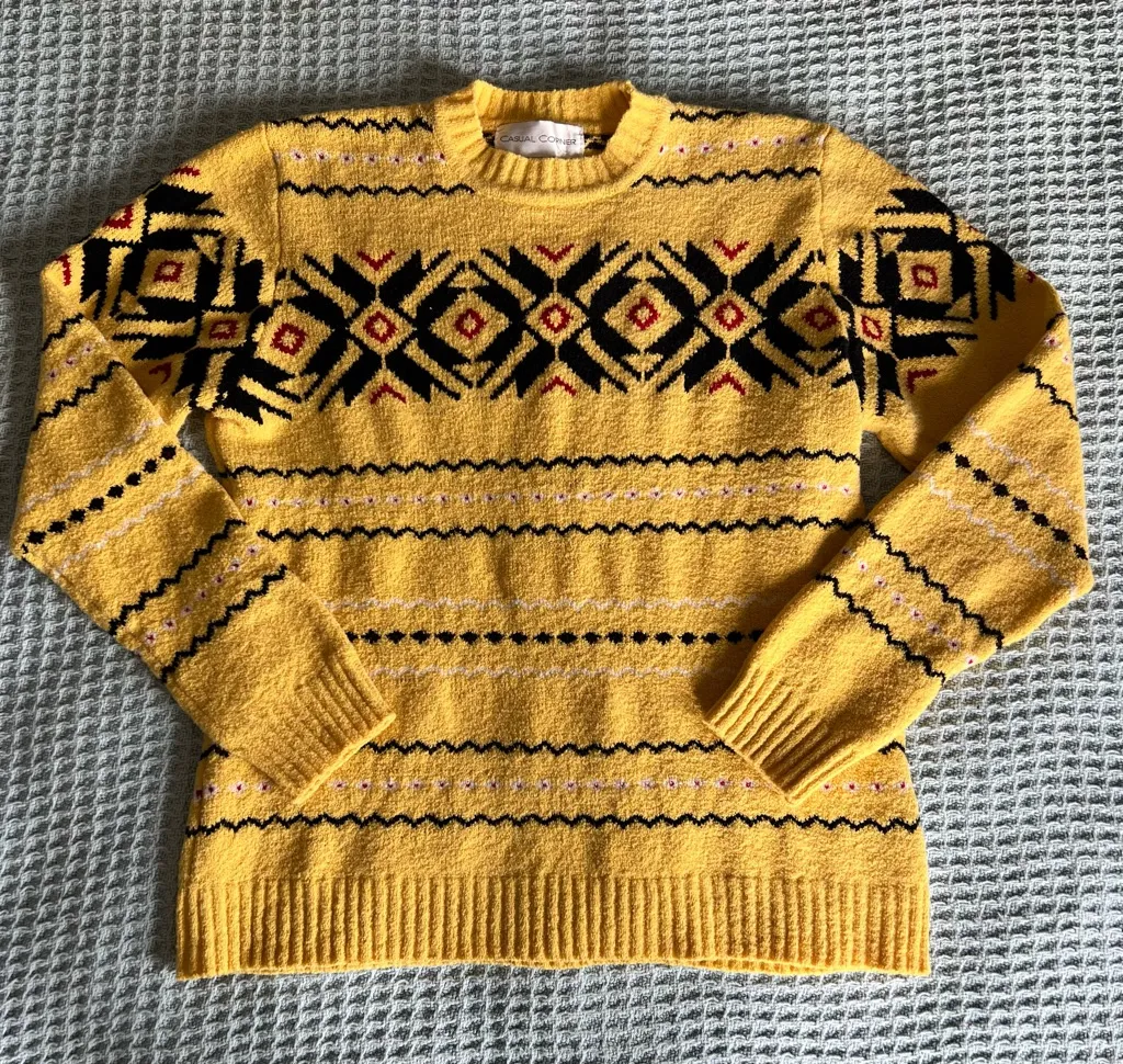 Casual Corner women’s crewneck fair isle sweater. Size large. Yellow with black/red/white fair isle motif. There are a couple faint dirt marks at the neckline - see photo. Otherwise this garment is in excellent vintage condition. Wool/acrylic/nylon/other fiber Made in Hong Kong Please review the photos and the way in which I measured the garment to determine how it will fit you. Bust: 19.75” Sleeve (seam to cuff): 24” Length: 23.75”