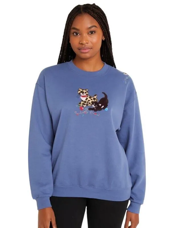 Vintage Cat Sweatshirt by Morning Sun – Top Stitch, Size Large, Embroidered Holiday Kittens Adorable vintage Top Stitch by Morning Sun sweatshirt in a soft faded periwinkle blue, featuring a playful embroidered and appliqué design of two holiday kittens with tangled Christmas lights. One cat has a leopard print coat, the other is black with a white chest—both with fuzzy textured detailing. Additional applique of the leopard-print cat appears on the right shoulder. Made in Honduras from a 50/50 cotton-poly blend. Tag size Large. Excellent pre-owned condition with no visible flaws. Perfect for holiday parties, cat lovers, or cozy winter lounging. Shoulder: 19.5, pit to pit: 22.5, sleeve: 24, length: 27 keywords: vintage Christmas cat sweatshirt, Morning Sun cat sweater, embroidered cat pullover, Top Stitch sweatshirt, leopard print kitten applique, black cat holiday sweater, women’s novelty sweatshirt, 90s cat clothing, fuzzy applique top, cozy animal lover shirt