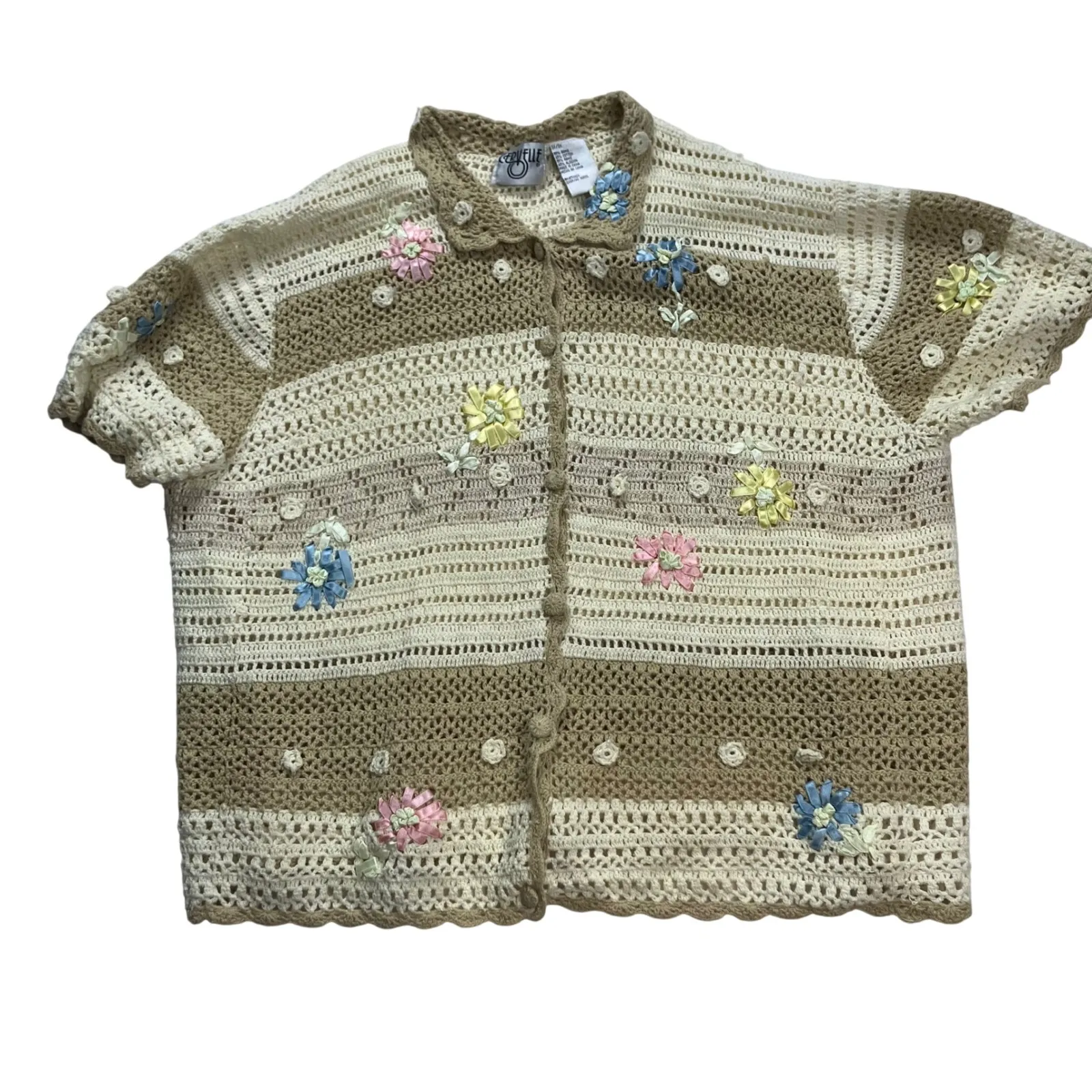Measurements: • Length: 22 in Pit to pit: 24.5 Style: Cardigan Department: Women Material: Ramie, Cotton, Algodon Neckline: Collared Theme: Hippie, Retro Type: Sweater Sleeve Length: Short Sleeve Features: All Seasons, Sheer Pattern: Striped Sleeve Type: Cap Sleeve Fabric Type: Crochet Accents: Crochet, Button, Bow Keywords: crochet, knit, cardigan, button up, floral applique, beige, cream, short sleeve, plus size, oversized, boho, cottagecore, vintage inspired, lightweight, summer top Ships fast from a smoke and pet free home.