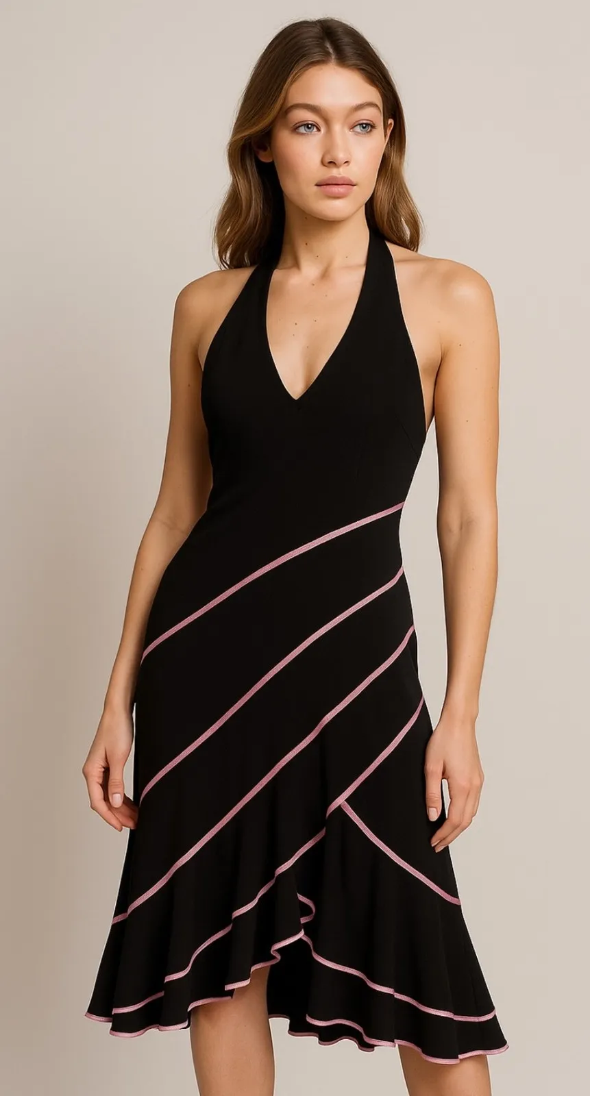 Elegant halter midi dress featuring a sophisticated black design accented with delicate pink trim. W... Show more