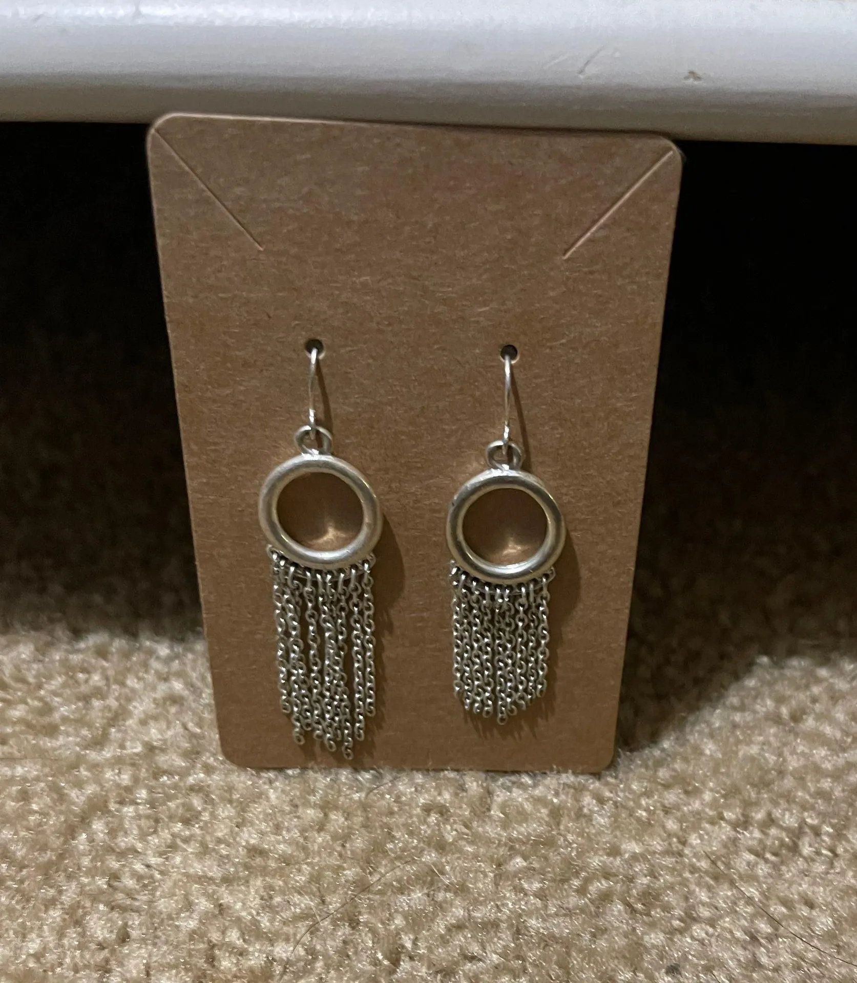 Silver dangly earrings with circle design. Have been very gently worn only a few times. Cardboard holder is the size of a business card for reference. Earrings have been repackaged as pictured for protection