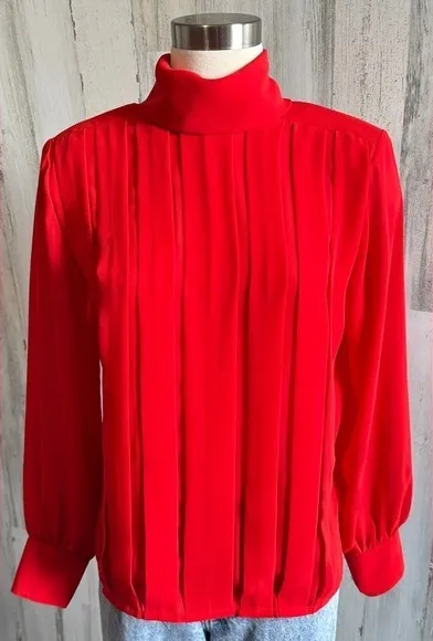 A stunning vintage red blouse by Chaus, featuring elegant pleats and a high neckline for a timeless,... Show more