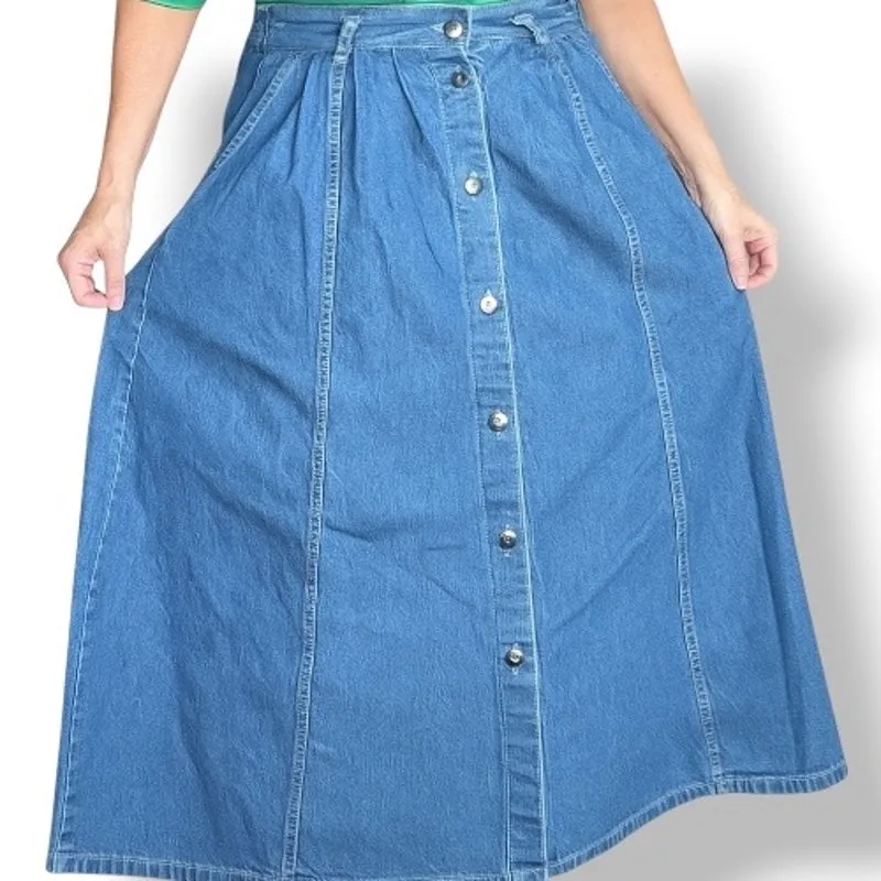 Vintage Cherokee Jean Skirt Classic high waist denim skirt with flattering panel seams A-line silhouette with midweight structured 100% cotton denim Belt loops with button front Cherokee embossed buttons Falls below the knee for a timeless feminine shape Unlined sturdy American-made denim Back elastic has no stretch check measurements Tagged a 14 fits like a modern medium Flat Lay Measurements 16 inch waist 20 inch hips 34 inch length This piece blends timeless American vintage charm with everyday wearability