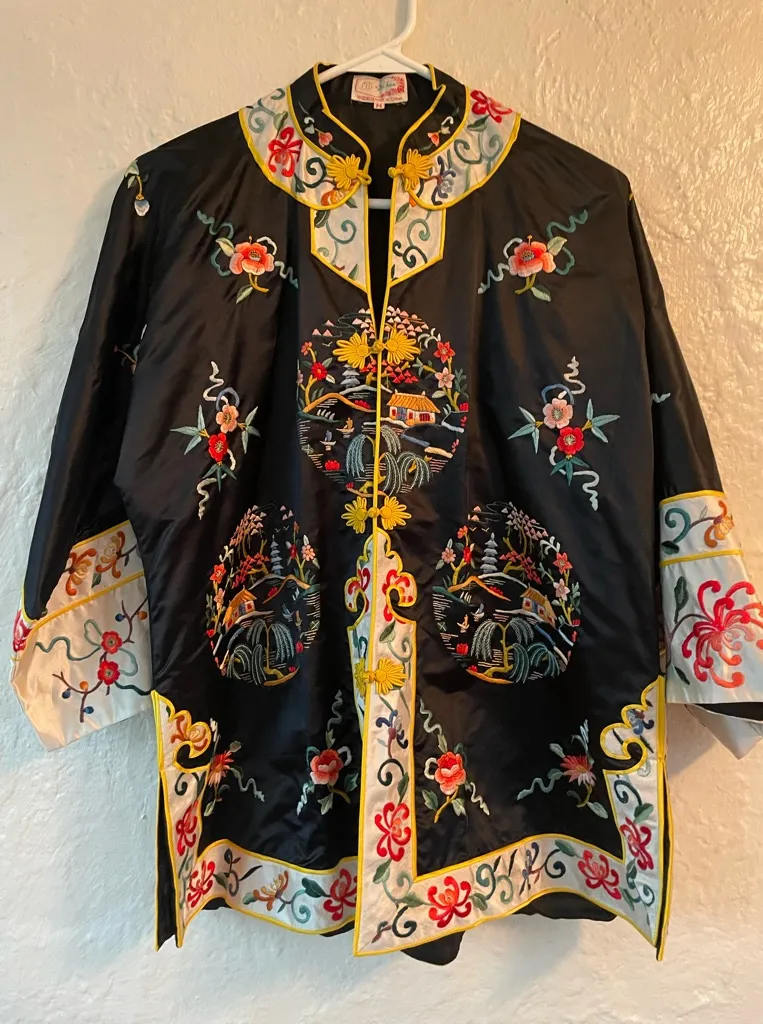 Vintage Chinese Silk Embroidered Robe or Jacket Black Silk Floral Motifs; M Size M - $175 - From Kate