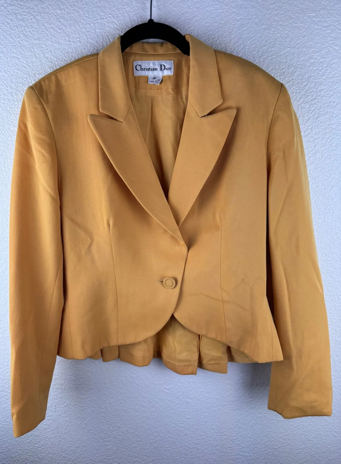 Measurements: • Shoulder to Shoulder: 16 in • Bust: 19 in • Waist: 17 in • Sleeve Length: 23 in • Blazer Length: 21 in Type: Blazer Outer Shell Material: Wool Style: Basic Jacket Department: Women Lining Material: Viscose Accents: Button, Pleated Features: Collared, Single-Breasted, Lined, Shoulder Pads Pattern: Solid Insulation Material: Wool Season: Spring, Fall Closure: Button Occasion: Workwear, Business Sleeve Length: Long Sleeve Keywords: Dior blazer, designer jacket, women's business casual, tailored blazer, pleated detail, classic style, luxury fashion, professional attire, mustard yellow, petite size, wool blend, vintage designer Offers welcome! Fast Shipping!