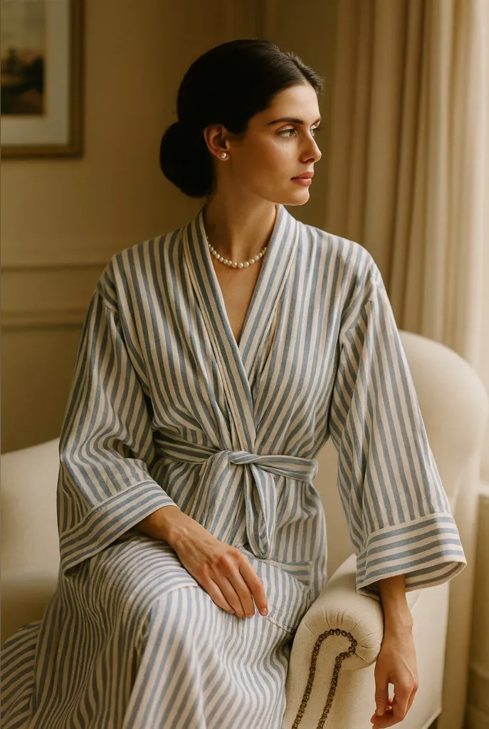 Authentic vintage Christian Dior Monsieur blue and white striped cotton robe. Made in Macau, crafted... Show more