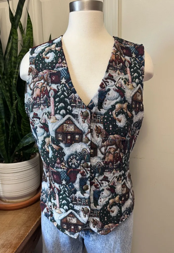 Vintage cotton blend tapestry vest featuring snowy village cabins, Santa, sleighs, and Christmas tre... Show more