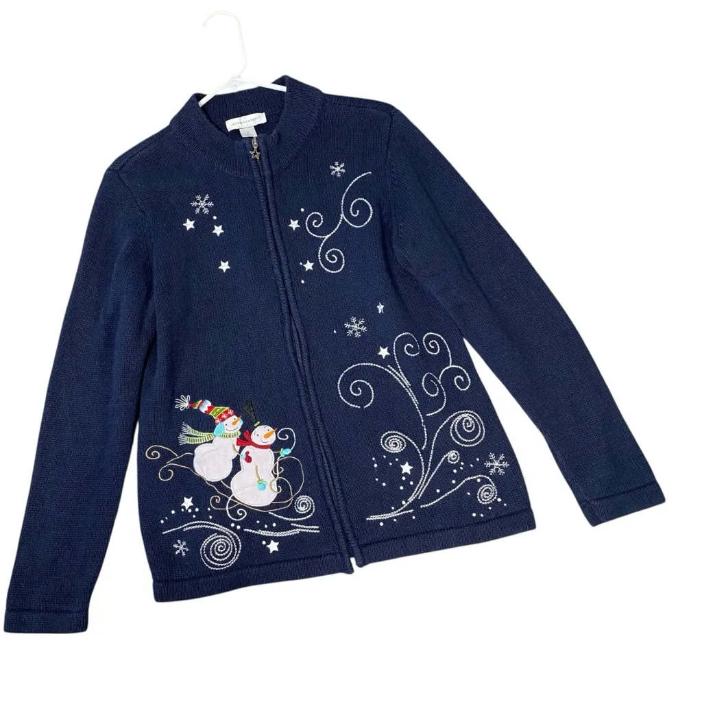 VINTAGE CHRISTOPHER & BANKS Embroidered Snowmen & Snowflakes Cardigan Blue Size M - $24 - From mirisa