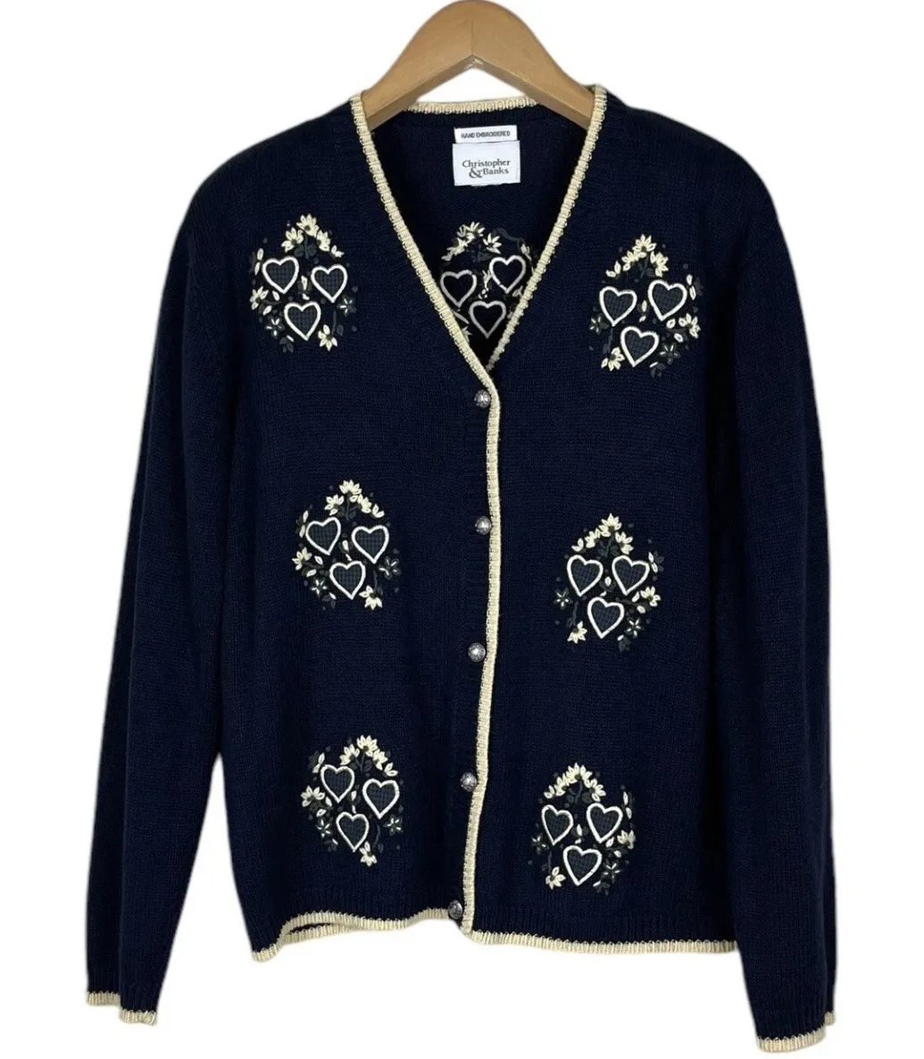 This is a navy and cream cardigan from Christopher & Banks. This cardigan has both floral and heart embroidery, heart decal buttons, and shoulder pads. *I listed this cardigan as an extra large, however there is no size tag so please refer to the measurements listed below.* Measurements Pit to Pit: 23 inches Length: 24 1/2 inches š I have a *SMOKE FRIENDLY* home š I have a *PET FRIENDLY* home (cat and dog) š I am open to offers on all of my listings š I list new items daily Good Condition