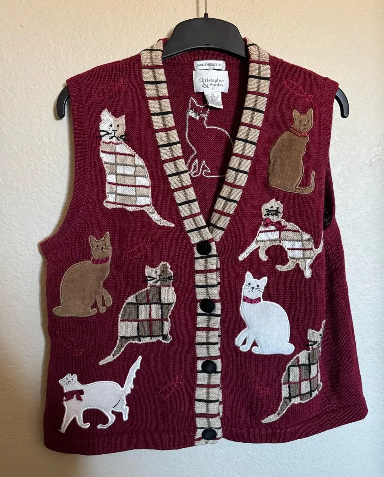 Vintage Christopher & Banks HandKnit Cat Embroidered Cardigan Sweater Vest Sz M Red Size M - $50 - From Valerija