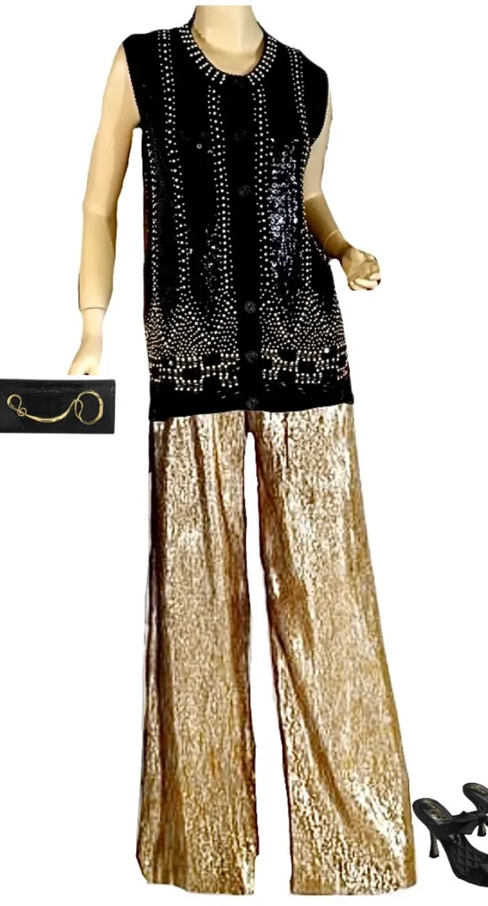 This listing is for the sweater vest pictured. Western Connection -vintage 80's/90's -black and gold -sequin covered front -knit sweater back -button front closure -unlined Vest is marked size small --please use measurements provided in photos for fit determination; Size tags alone, are not a reliable source. Item is free of stains or holes. Loose sequins and threads are always possible with heavily sequined pieces Preowned items (especially vintage pieces) are subject to any minor imperfections which come with an article of clothing that has been washed and worn; these signs of wear generally include light pilling or fuzzing, loose threading or wrinkling. Some listings may not include these issues, but as a general disclaimer, please be aware it is possible. Unless indicated, there is no major damage to a piece. To mitigate the cost of the items and avoid any issues customers may have with allergies, we leave desired cleaning to the new owners.