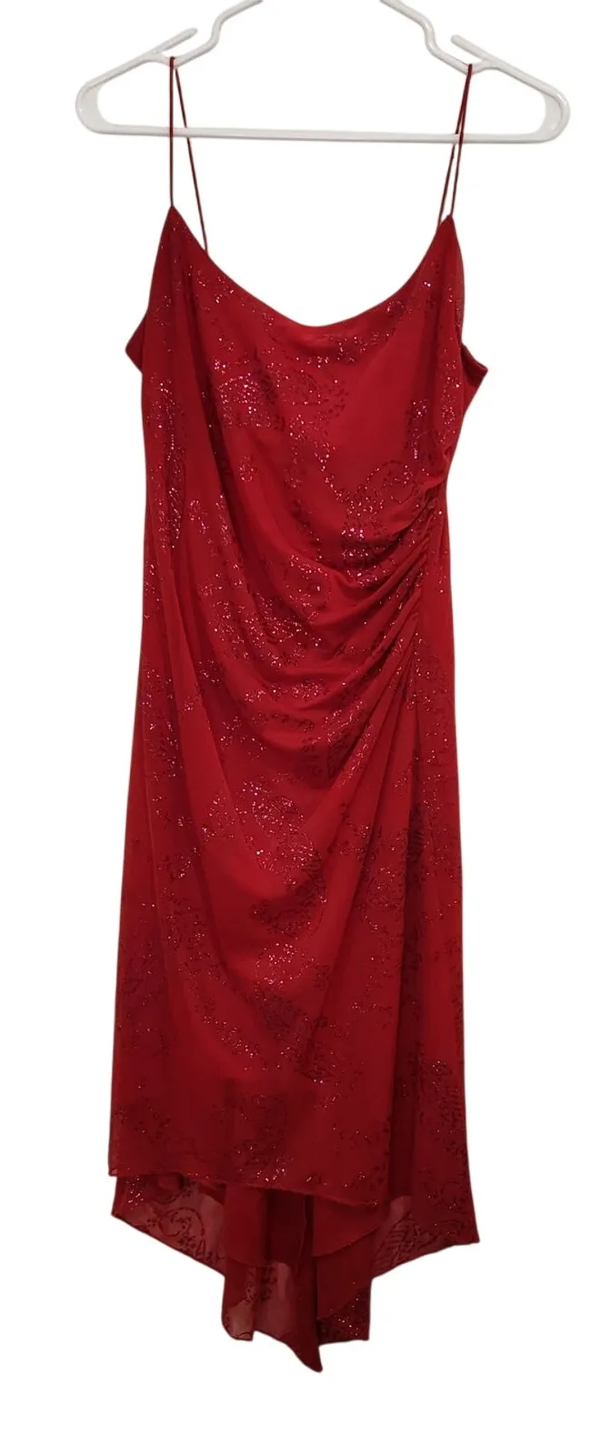 Great used condition Standout red shimmer party dress featuring ruched detailing, sleeveless silhou... Show more
