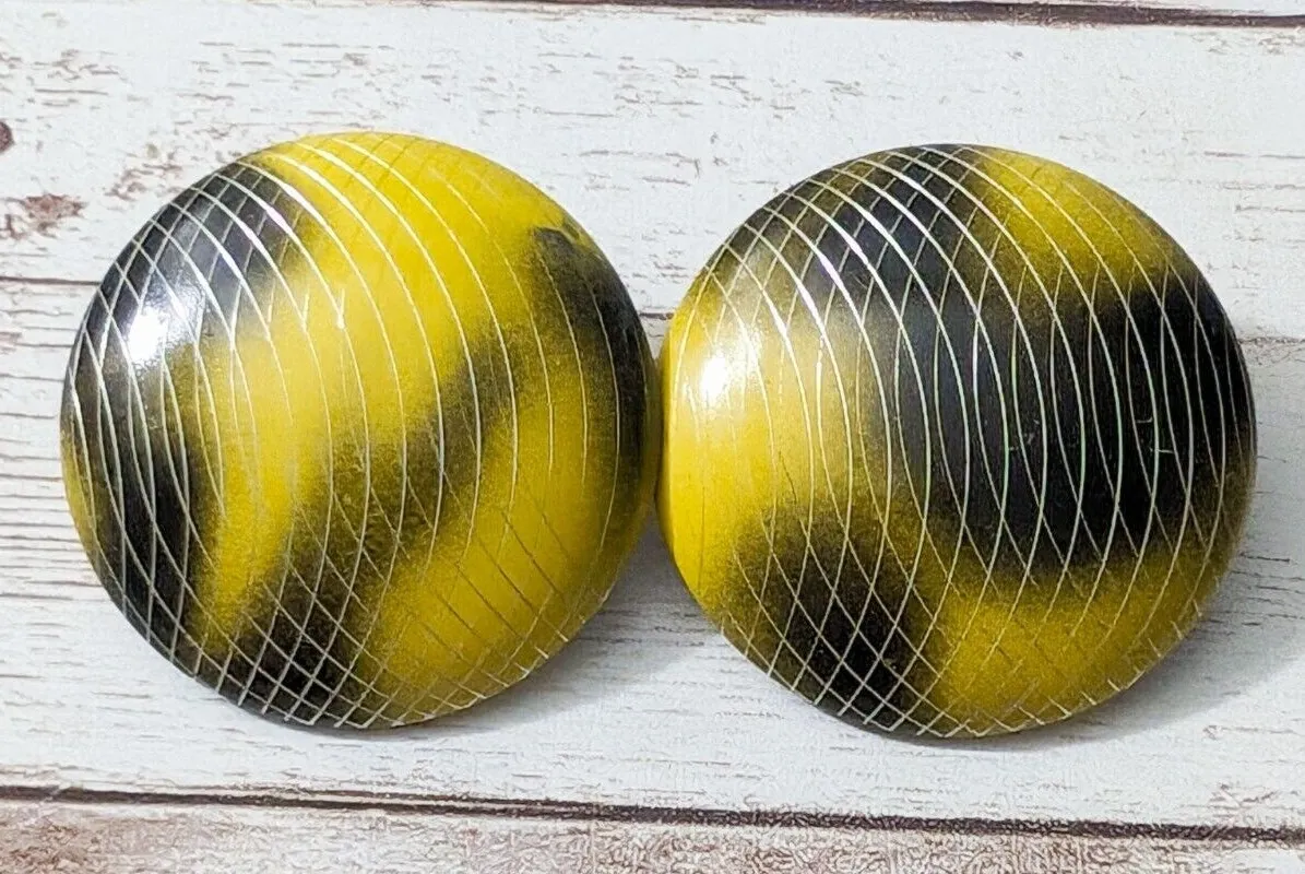 These earrings measure about 1 & 3/8" long. Detail lines are a metallic tone. Light marks to front. Some imperfections and rust to rear. These are vintage earrings and are sold as pictured. Some tarnish and signs of wear may be visible. Please review all pictures before purchase. Please note these earrings are used/preloved. If you have any questions please feel free to drop me a message.