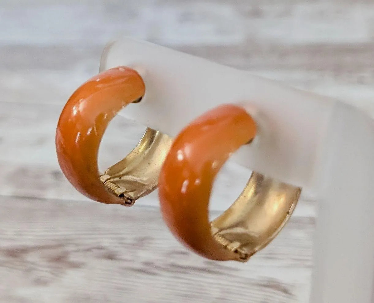 These earrings measure about 1". Some paint chipping to the burnt orange - is noticable as is to front, rear and sides, one patch is quite large. Some gold tone wear to edges and where the earring meets the ear. Some marks to inside. Preowned vintage earrings, sold as shown - I am unsure of material type(s) because of this. Pictures show different angles for you to review - while I attempt to note any defects, some tarnish/signs of wear may be visible that are not otherwise stated. Earrings are tested and photographed on a thin/smooth earring stand (not included) to show that the clips are in working order. If you have any questions please feel free to drop me a message.