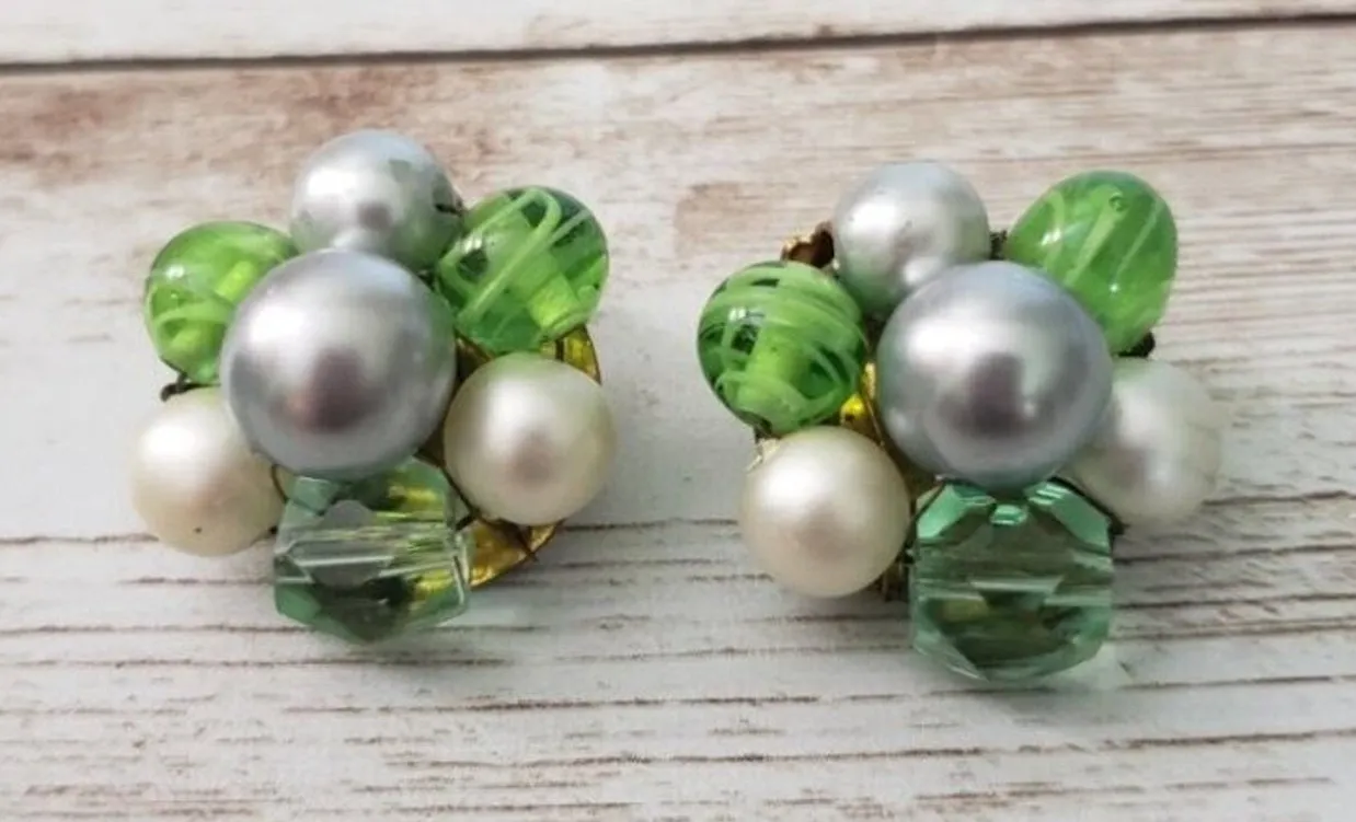 Vintage Clip On Earrings - Cluster in Different Shades of Green These earrings measure about 7/8" long. Light marks. Some chipping to some of the colored faux pearls. Some tarnish to metal area including rear. Have been cleaned but still retain the slight scent of perfume. Preowned vintage earrings, sold as shown - I am unsure of material type(s) because of this. Pictures show different angles for you to review - while I attempt to note any defects, some tarnish/signs of wear may be visible that are not otherwise stated. If you have any questions please feel free to drop me a message.