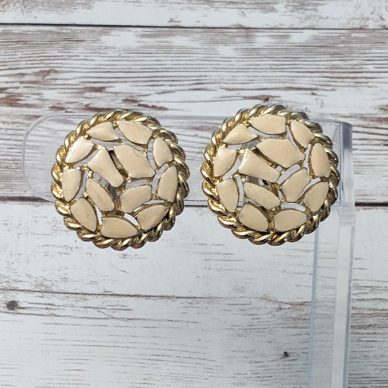 These earrings measure just over 7/8". Some marks and signs of wear to the front as well as some slight chipping in places. Cream tone heading more towards beige with a very very slight pink undertone in some lights. Some tarnish and gold tone wear to rear. Preowned vintage earrings, sold as shown - I am unsure of material type(s) because of this. Pictures show different angles for you to review - while I attempt to note any defects, some tarnish/signs of wear may be visible that are not otherwise stated. Earrings are tested and photographed on a thin/smooth earring stand (not included) to show that the clips are in working order. If you have any questions please feel free to drop me a message.