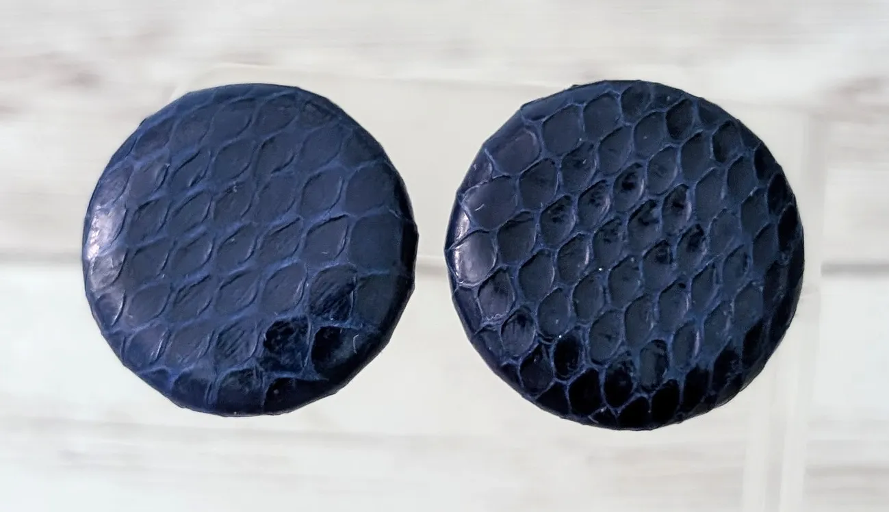 These earrings measure about 1 & 1/8". Scales design. Center of one is pushed in some. Scales are more obvious on one that the other. Some surface damage and chips/flaking that may continue. Tarnish and marks to rear. Preowned vintage earrings, sold as shown - I am unsure of material type(s) because of this. Pictures show different angles for you to review - while I attempt to note any defects, some tarnish/signs of wear may be visible that are not otherwise stated. Earrings are tested and photographed on a thin/smooth earring stand (not included) to show that the clips are in working order. I ship quickly and provide tracking information but delivery times are an estimate. Item is located in the United States. Country of manufacture cannot determined.