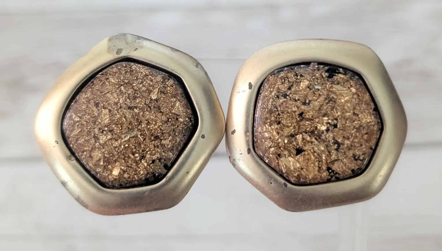 These earrings measure about 1 & 3/8". Heavy gold tone chipping to front, sides and rear. Some stain... Show more