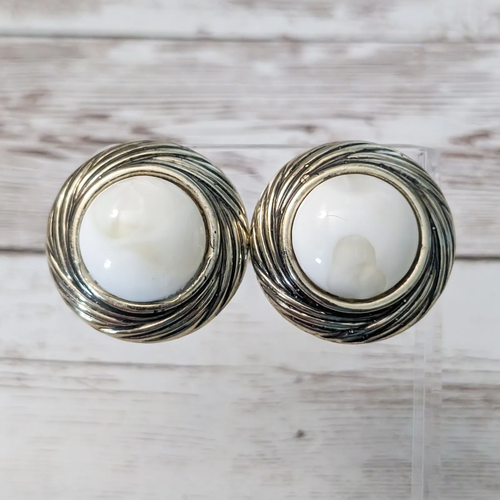 These earrings measure about 1.25". Statement earrings. Gold tone halo has black areas in the crevices, possible by design but could be from age and wear. Some gold tone chipping to front and rear. Off white center has a marbled cream pattern. Rear has marks and signs of wear. Some tarnish and discoloration to the clips and what looks like glue residue visible that is red in color. Preowned vintage earrings, sold as shown - I am unsure of material type(s) because of this. Pictures show different angles for you to review - while I attempt to note any defects, some tarnish/signs of wear may be visible that are not otherwise stated. Earrings are tested and photographed on a thin/smooth earring stand (not included) to show that the clips are in working order. If you have any questions please feel free to drop me a message.