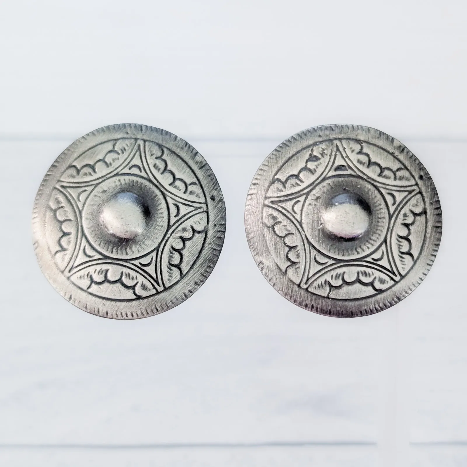 These earrings measure about 1 & 3/8". Slightly curved inward by design, but one seems to be a bit move curved than the other. Some darkening to the silver tone to the front making it more of a greyish tone but this could be by design. Some marks and signs of wear. Preowned vintage earrings, sold as shown - I am unsure of material type(s) because of this. Pictures show different angles for you to review - while I attempt to note any defects, some tarnish/signs of wear may be visible that are not otherwise stated. Earrings are tested and photographed on a thin/smooth earring stand (not included) to show that the clips are in working order. If you have any questions please feel free to drop me a message.