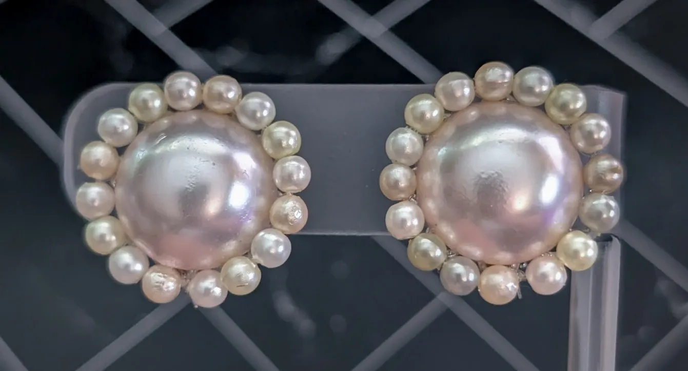 These earrings measure about 15/16". Stamped Hong Kong. Light weight. Some color and spacing variation in halo faux pearls - some are more yellow, some are more pinkish. Center cream area leans towards a pink hue. Some impefections to the the front. Rear clips have some tarnish/discoloration. Preowned vintage earrings, sold as shown - I am unsure of material type(s) because of this. Pictures show different angles for you to review - while I attempt to note any defects, some tarnish/signs of wear may be visible that are not otherwise stated. Earrings are tested and photographed on a thin/smooth earring stand (not included) to show that the clips are in working order. I ship quickly and provide tracking information but delivery times are an estimate. Item is located in the United States. Country of manufacture cannot determined.