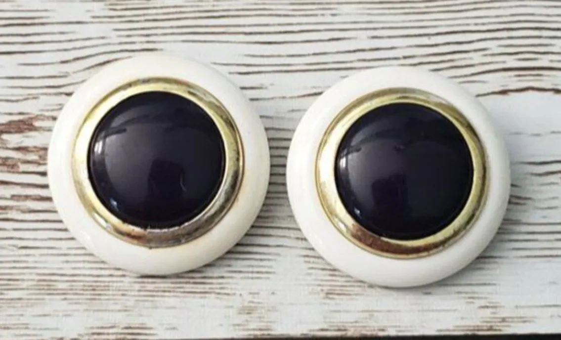 These earrings measure just over 1 1/8" wide. Not sure if center is black or a very dark blue. Some wear to the gold area where the gold is wearing off. Some glue visible to rear. See pictures for details. These are vintage earrings and are sold as pictured. Some tarnish and signs of wear may be visible. Please review all pictures before purchase. If you have any questions please feel free to drop me a message.