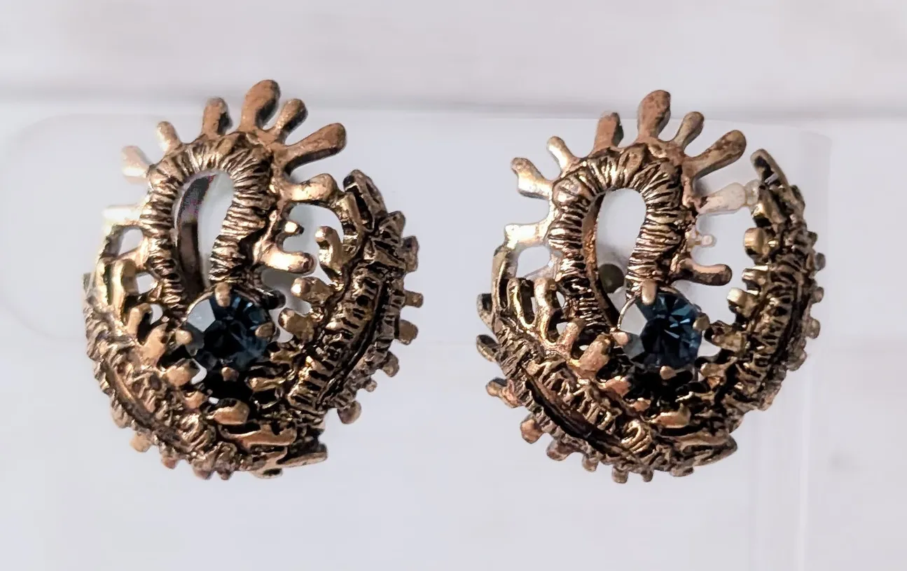 These earrings measure about 1". Very dark brassy gold tone. Some tarnish. I am unsure of the material of the gems. Preowned vintage earrings, sold as shown - I am unsure of material type(s) because of this. Pictures show different angles for you to review - while I attempt to note any defects, some tarnish/signs of wear may be visible that are not otherwise stated. Earrings are tested and photographed on a thin/smooth earring stand (not included) to show that the clips are in working order. If you have any questions please feel free to drop me a message.