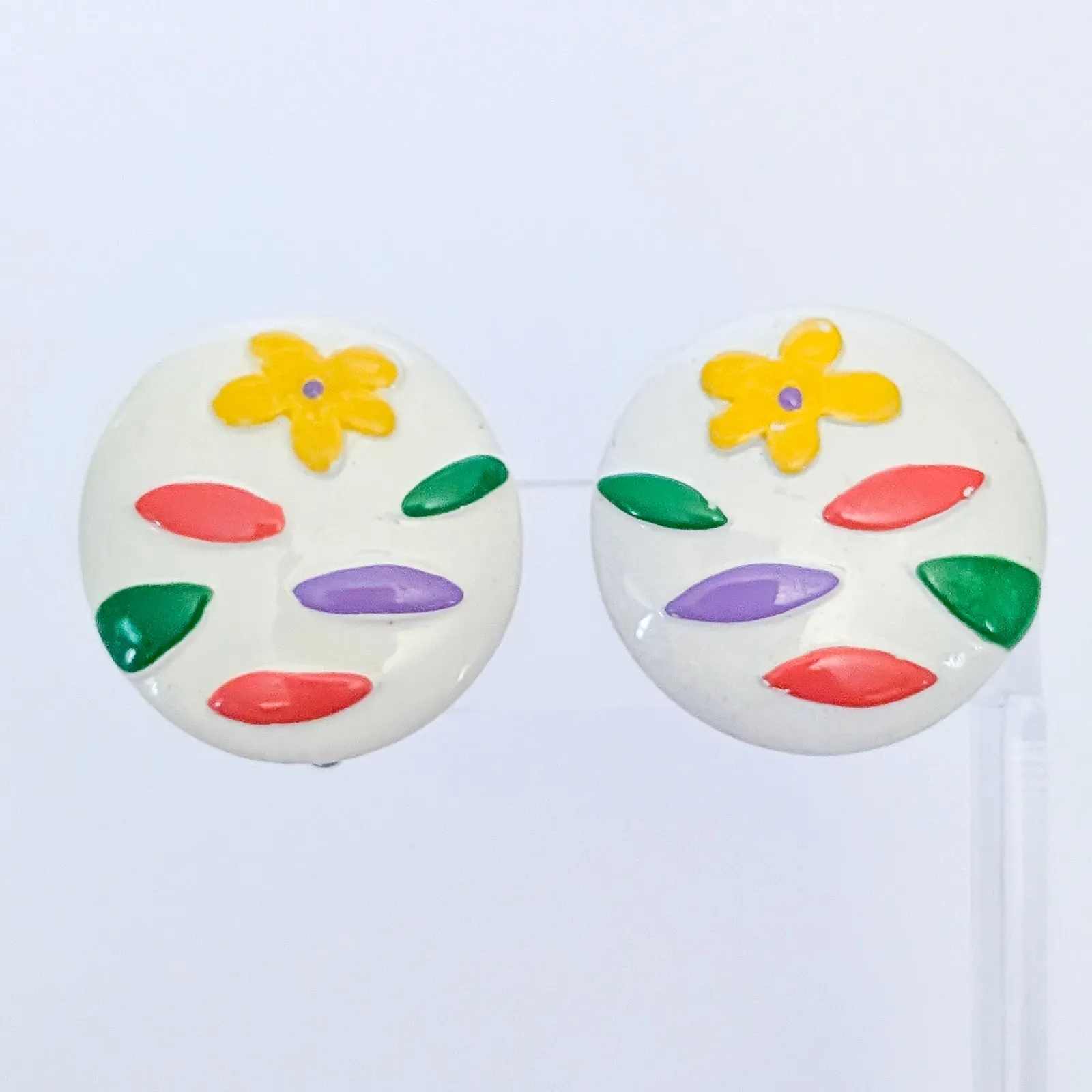 These earrings measure about 1 & 1/8". Small paint chips to the front and sides. Some marks, tarnish/discoloration and signs of wear to rear. Some glue visible to rear. Preowned vintage earrings, sold as shown - I am unsure of material type(s) because of this. Pictures show different angles for you to review - while I attempt to note any defects, some tarnish/signs of wear may be visible that are not otherwise stated. Earrings are tested and photographed on a thin/smooth earring stand (not included) to show that the clips are in working order. If you have any questions please feel free to drop me a message.