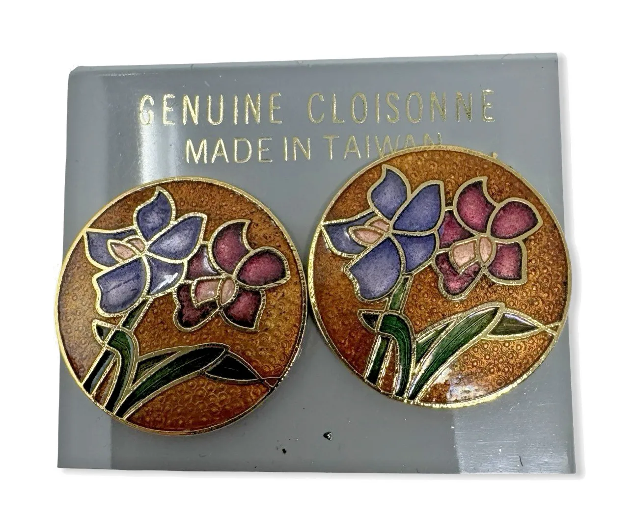 Stunning vintage genuine cloisonné clip-on earrings featuring a detailed floral design resembling orchids or lilies, set against a rich textured amber/gold enamel background. These earrings are mounted on the original card marked “Genuine Cloisonné – Made in Taiwan,” indicating mid- to late-20th-century production. The circular design showcases beautiful enamel colors including purple, burgundy, green, and soft pink, all outlined with classic cloisonné wirework and finished in gold-tone metal. DETAILS: * Type: Clip-on earrings * Material: Cloisonné enamel, gold-tone metal * Design: Floral / Orchid motif * Shape: Round * Size: Approx. 1 inch * Origin: Made in Taiwan * Era: Vintage (circa mid–late 20th century) * Condition: Very good vintage condition * Light surface wear consistent with age * Clips are secure and function properly * Please review all photos for exact condition WHY YOU’LL LOVE THEM: * Genuine vintage cloisonné craftsmanship * Warm amber tones with vibrant floral color * Comfortable clip-on style (no piercings needed) * Great for collectors, retro fashion, or gifting SHIPPING & NOTES: * Ships carefully and securely * Colors may vary slightly due to lighting and screen differences * Vintage items may show minor age-related wear—this is part of their charm