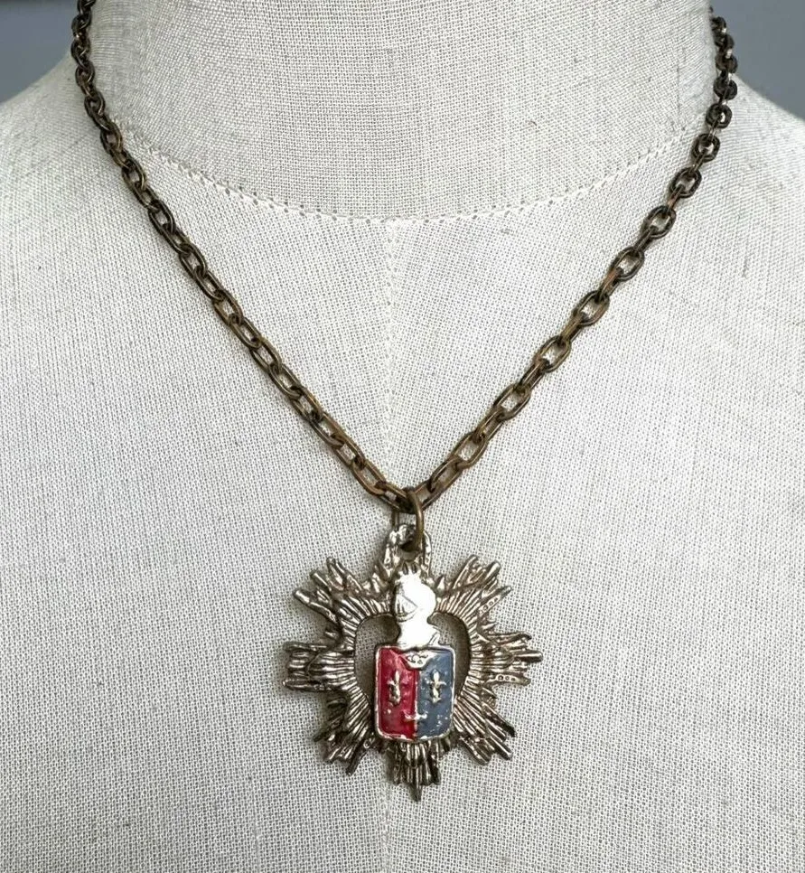 Vintage Coat of Arms Gold Tone Enamel White Knight Starburst Medallion Pendant necklace... Show more