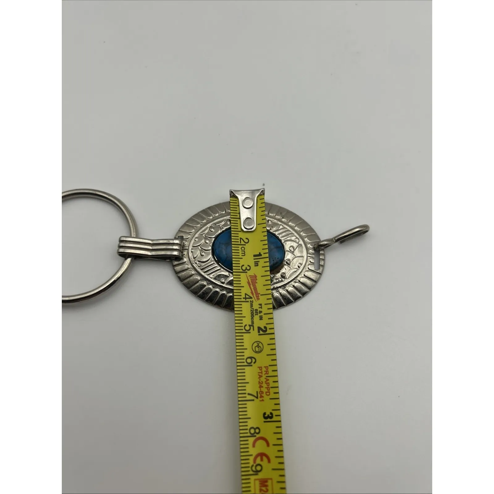Vintage silver-tone concho belt featuring oval stamped metal conchos with faux turquoise cabochon centers. Linked with circular rings and finished with an adjustable chain closure. Perfect western, boho, or festival accessory — looks great with jeans, skirts, or dresses.