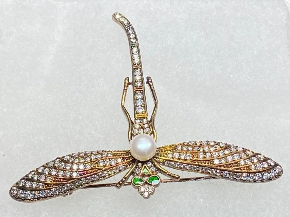Dragonfly Brooch with Pearl, Rhinestones, and Bright Enamel Green Eyes Clasp/Closure Type: Double T... Show more