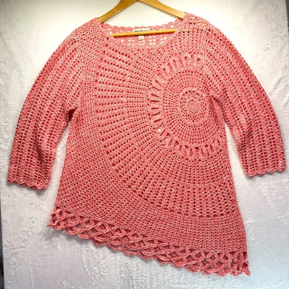 Vintage Norm Thompson Coral colored Loose Crochet Knit Sweater with Diagonal Hem. Boho medallion kni... Show more