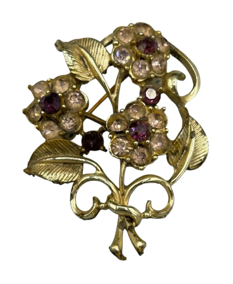 Beautiful authentic vintage COTO brooch featuring an elegant floral bouquet design in gold-tone metal. This mid-century piece showcases prong-set rhinestones in soft champagne and deep purple hues, accented by sculpted leaves and graceful open metalwork. COTO jewelry is known for its quality construction and refined designs, making this a standout collectible example of 1940s–1950s vintage costume jewelry. ✨ Details • Brand: COTO • Era: Vintage (circa 1940s–1950s) • Finish: Gold tone • Stones: Champagne & purple rhinestones • Setting: Prong set • Motif: Floral bouquet / spray • Closure: Secure rollover safety clasp • Construction: Dimensional, open-back design ✨ Condition Very good vintage condition. Stones are intact and bright. Light age-appropriate patina to metal consistent with vintage pieces. Please see close-up photos. ✨ Style Perfect for blazers, coats, dresses, scarves, or as a statement accent for vintage, romantic, or cottagecore styling. 📦 Ships carefully packaged.