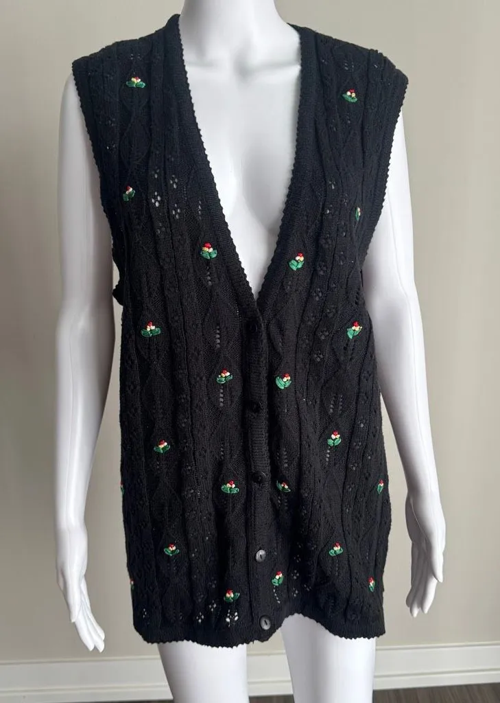 Vintage Cottage Core Crotchet Knit Sweater Vest Cardigan Black With Embroidery Red Size XL - $26 - From Jade