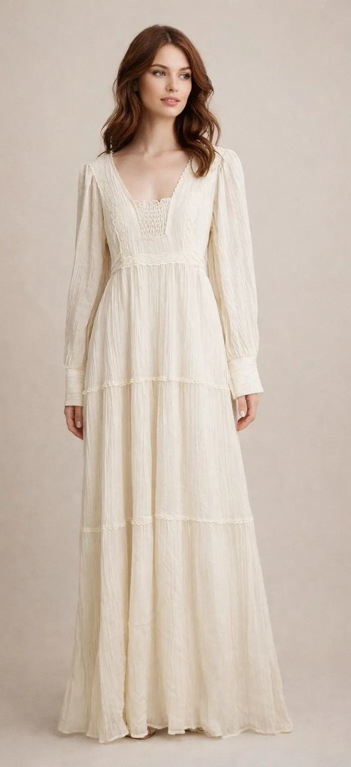 Vintage Cotton Gauze Ivory White Long Sleeve Maxi Gown 70s Size S Empire Tie waist No size or material tag so using measurements to determine size 18" underarm to underarm 57" long 15.4" across at empire waist line Small spot on sleeve Gunne Sax style - may even be!