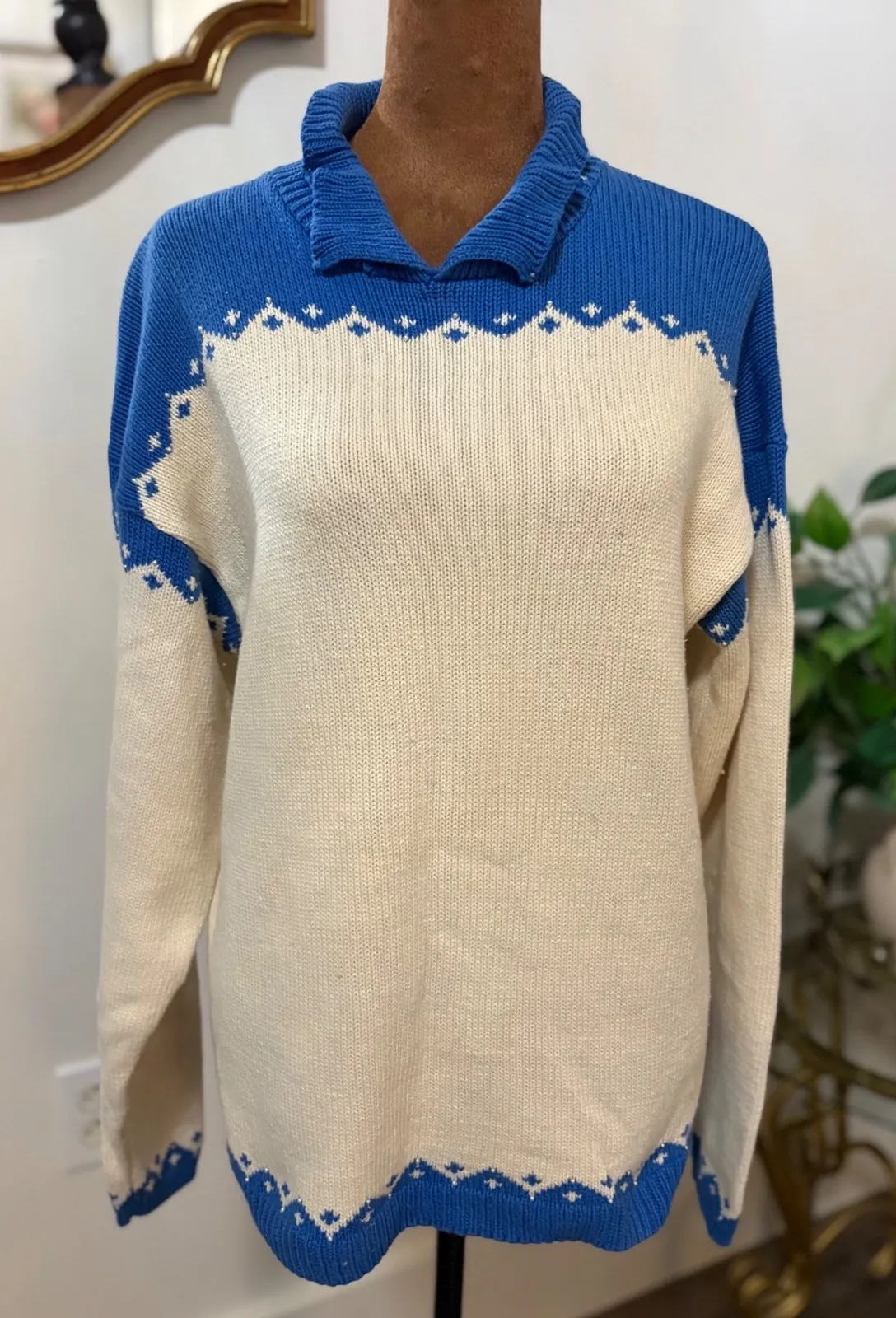Cozy vibes meet timeless style in this charming vintage sweater. Its soft knit construction promises warmth and comfort, while the eye-catching blue and cream geometric pattern adds a touch of retro flair. The classic collared neckline elevates the design, making it a versatile piece for layering or wearing on its own. Imagine yourself strolling through a crisp autumn park, sipping hot cocoa by a crackling fireplace, or adding a touch of vintage cool to a casual weekend brunch. Owoman Style: Pullover Color: Blue Department: Women Type: Sweater Material: 100% Cotton Sleeve Length: Long Sleeve Neckline: Collared Features: Knit, Vintage, Retro, Geometric Pattern, Collared Pattern: Geometric Sleeve Type: Raglan Sleeve Fabric Type: Knit Accents: Button Keywords: vintage sweater, collared sweater, knit sweater, geometric sweater, blue sweater, cream sweater, cotton sweater, retro sweater, womens sweater, vintage clothing, collared knitwear, grandmacore fashion, cottagecore style, preppy sweater