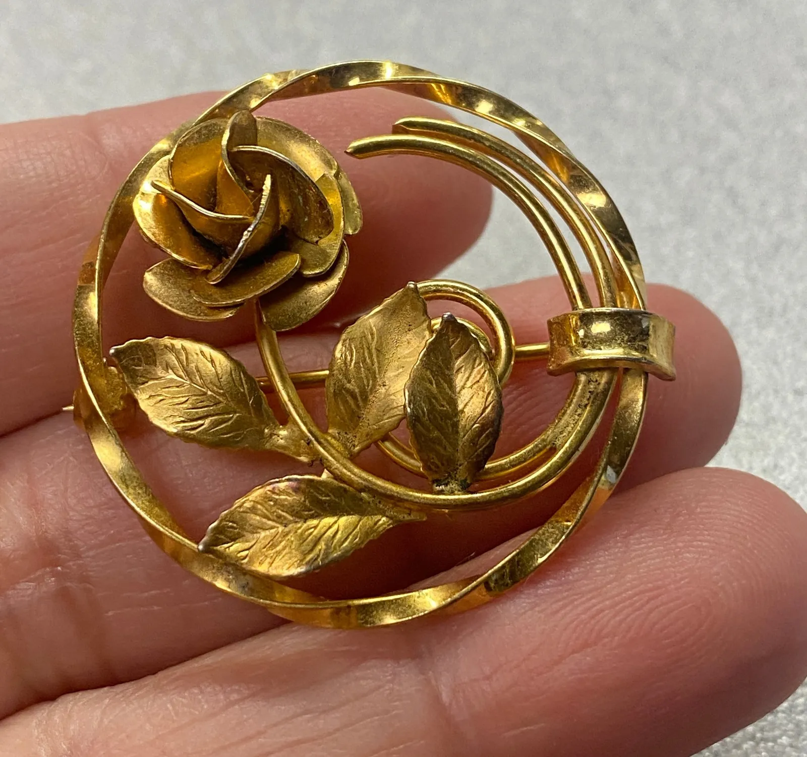 Preloved in excellent condition Please see all photos for close up details and measurement. Type: Brooch Main Stone Color: Gold Metal: Yellow Gold Metal Purity: Gold Filled Main Stone Treatment: Not Enhanced Department: Women Shape: Flower Base Metal: Gold Theme: Flowers & Plants, Nature Era: Retro (1935-1950) Year Manufactured: 1930-1939 Unit Type: Unit Keywords: 12 gold filled, rose brooch, leaf pin, vintage jewelry, Art Nouveau, floral design, elegant accessory, statement pin, gift for her, designer brooch, antique style, heirloom, brooch pin